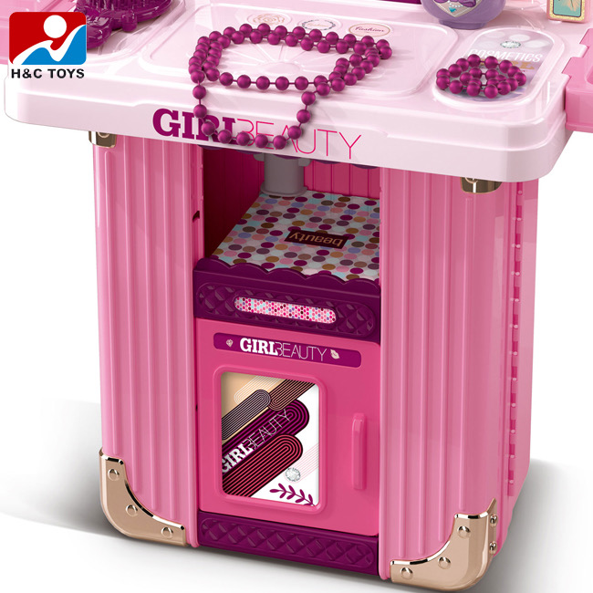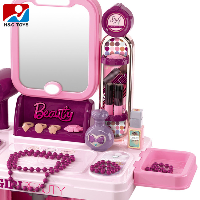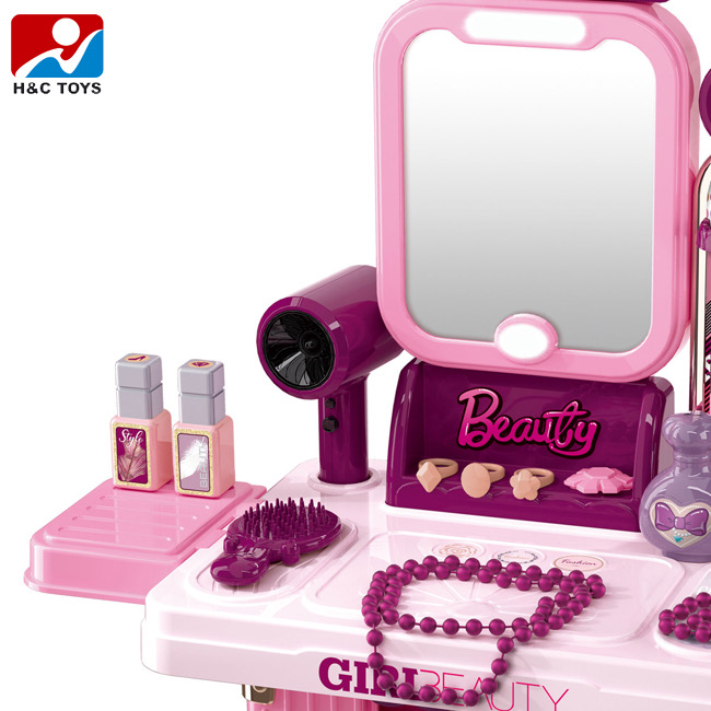 • ست ۱۸ در ۱ شامل میز آرایش با آینه نورانی، سشوار و شانه بنفش، لاک ناخن، رژ لب، عطر، گردنبند مرواریدی صورتی، گوشواره، انگشتر گلدار و کشوهای نگهداری