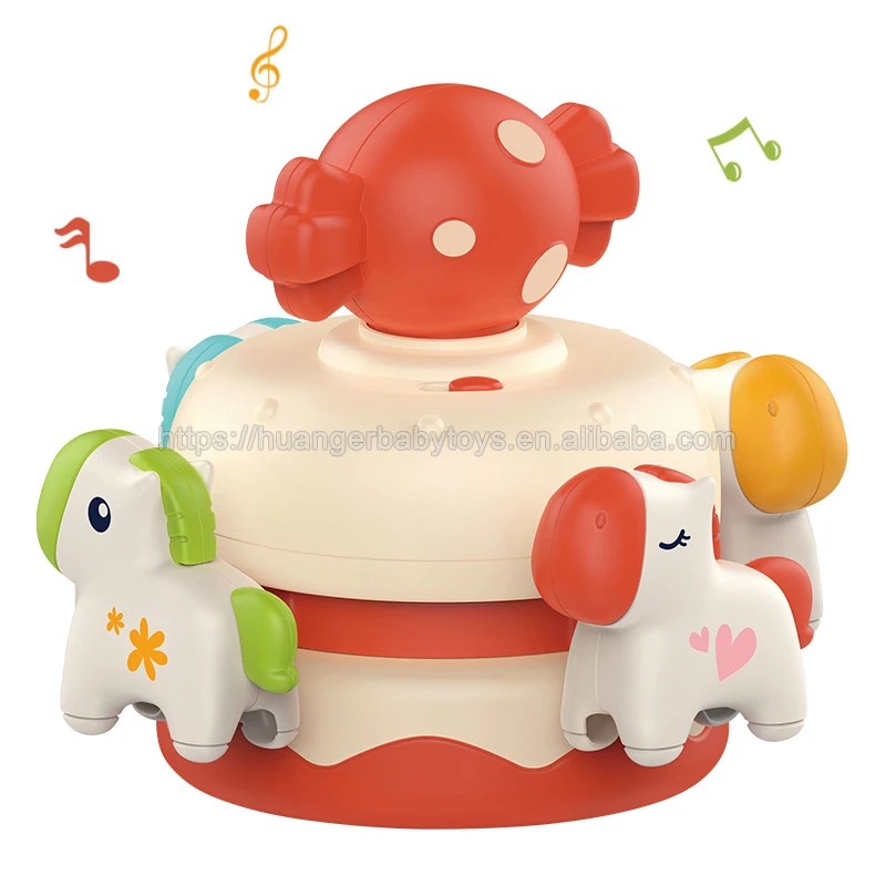 • با چرخاندن مکانیزم، کاروسل کارتونی شروع به چرخش کرده و همراه با موسیقی ملایم میچرخد