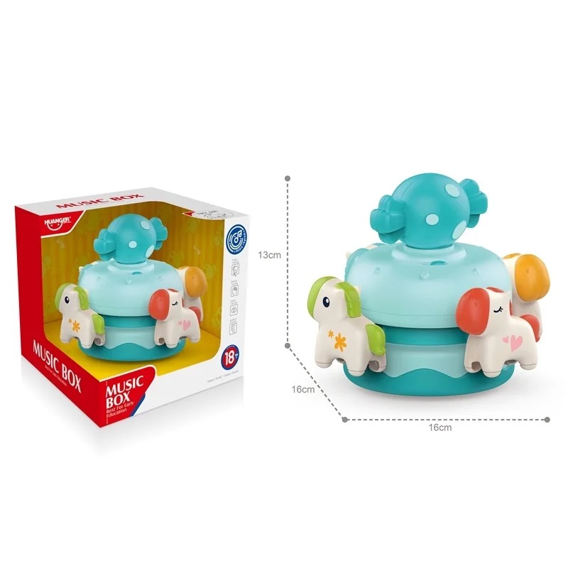 جعبه موسیقی کودک با طراحی کاروسل کارتونی و پایههای مکشی، قابل استفاده روی میز و مناسب برای آرامکردن نوزاد. ساختهشده از ABS ایمن، بدون لبههای تیز و مناسب نوزادان ۰ تا ۳ سال.