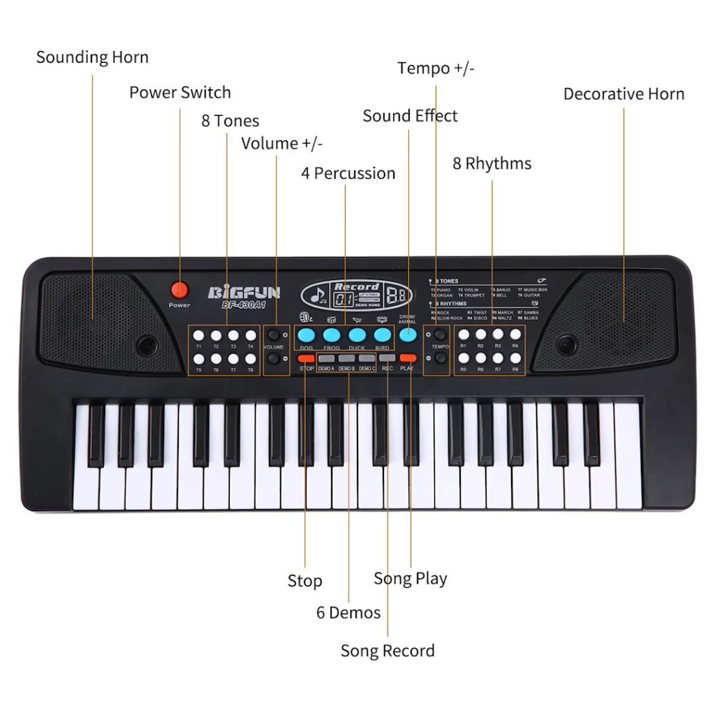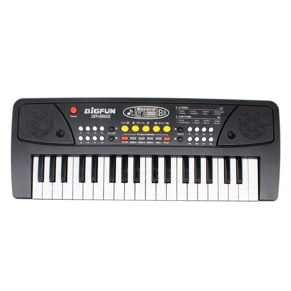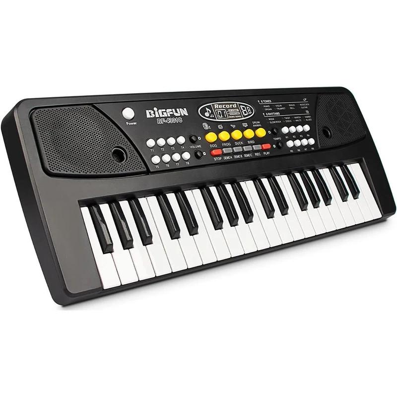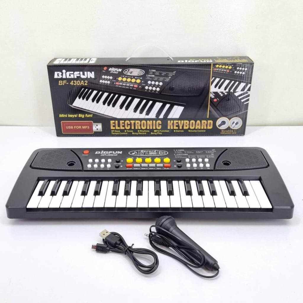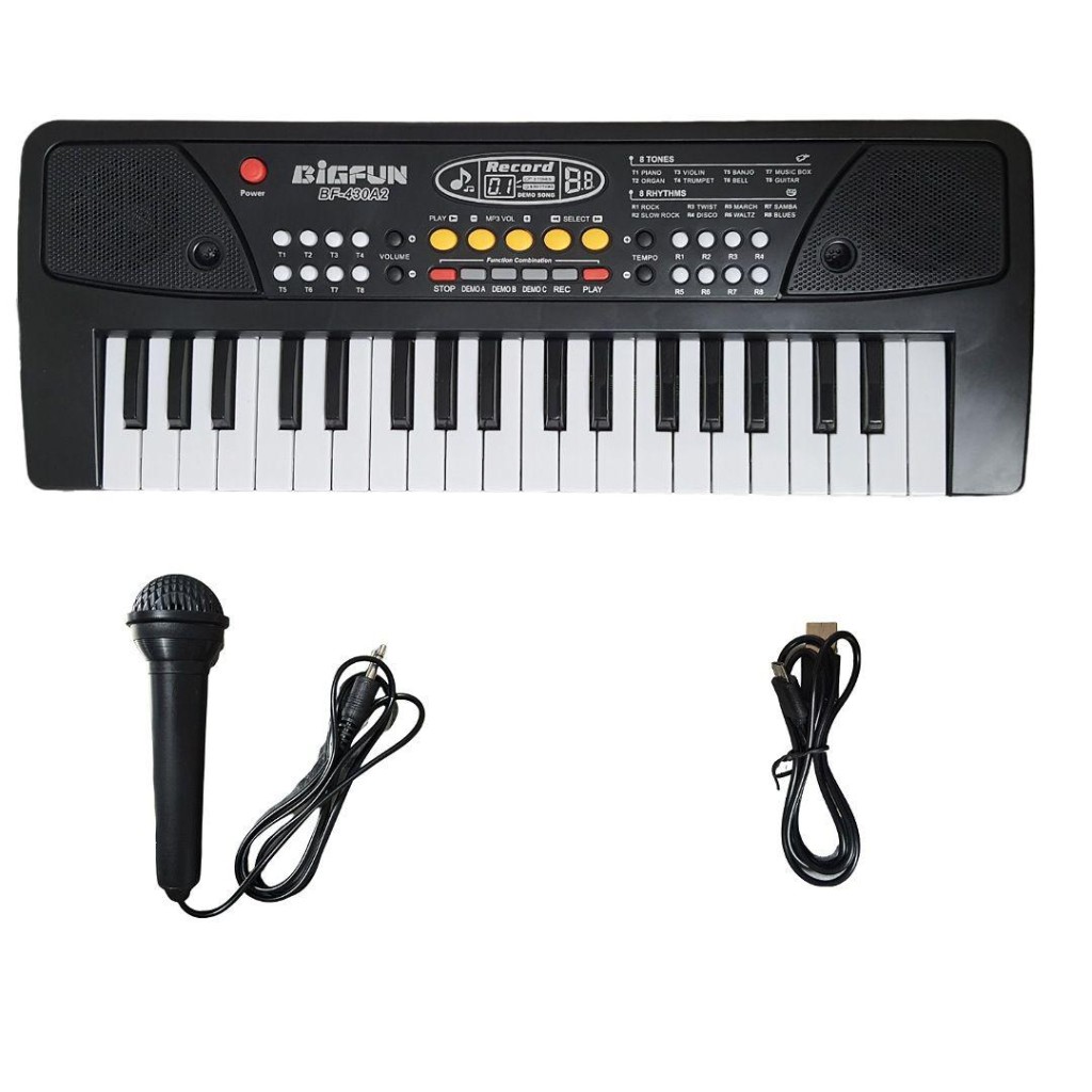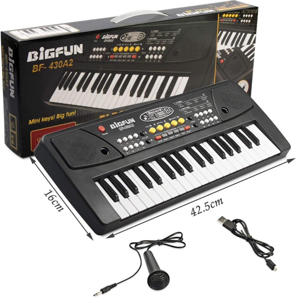 ارگ 43 سانتیمتری بیگ فان با دکمههای پخش دمو، تنظیم صدا، ورودی فلش MP3، میکروفون و امکان استفاده با USB یا باتری؛ انتخابی مناسب برای شروع یادگیری موسیقی.
