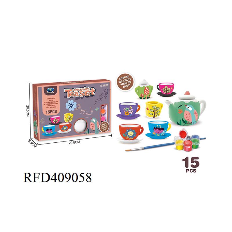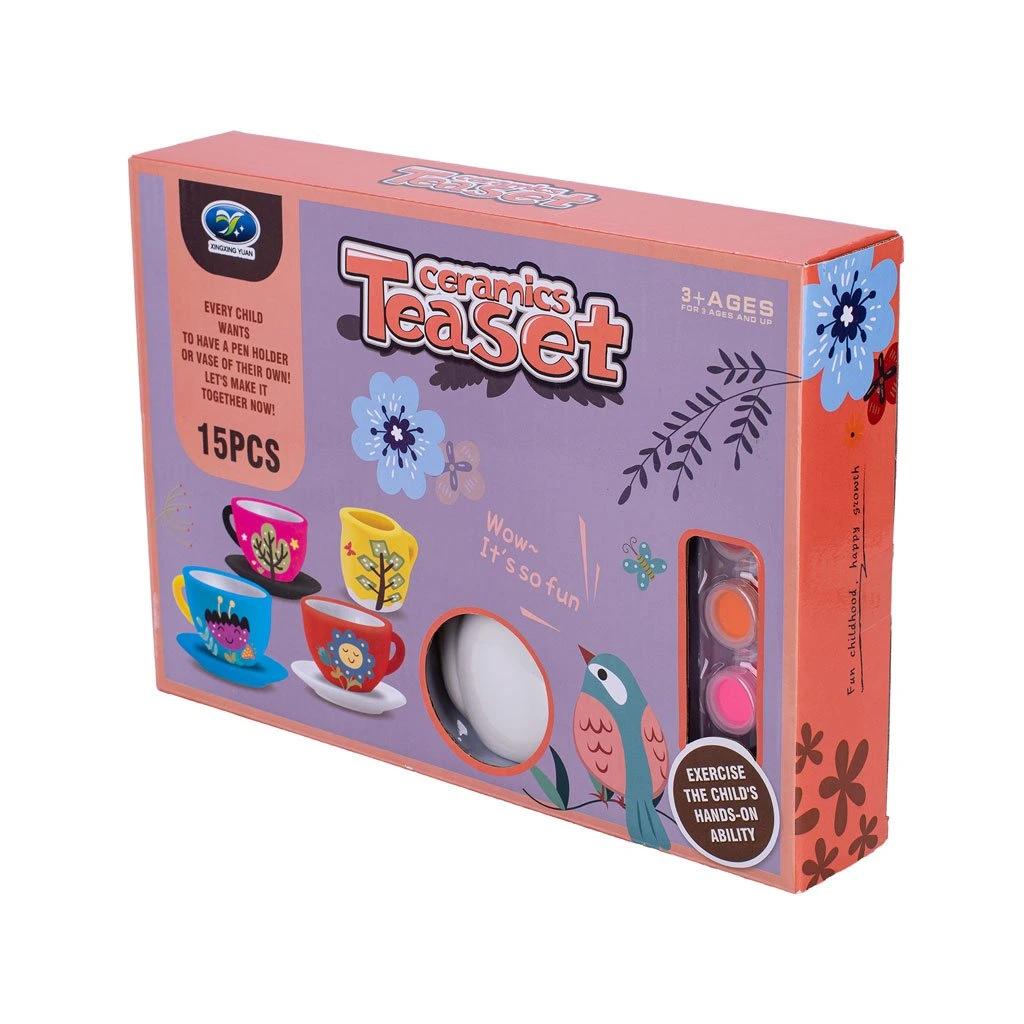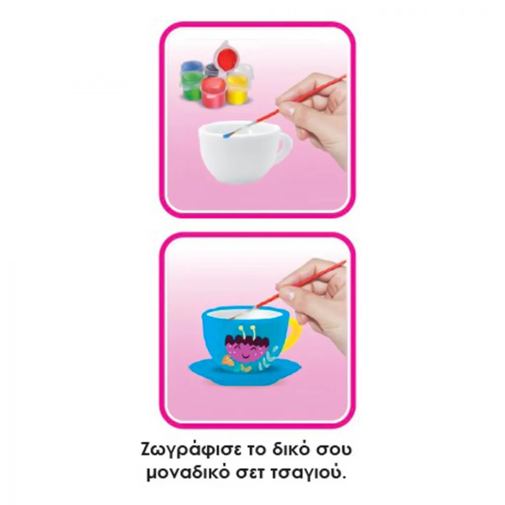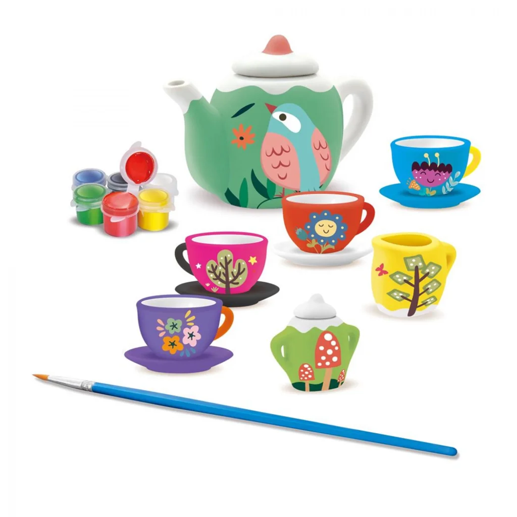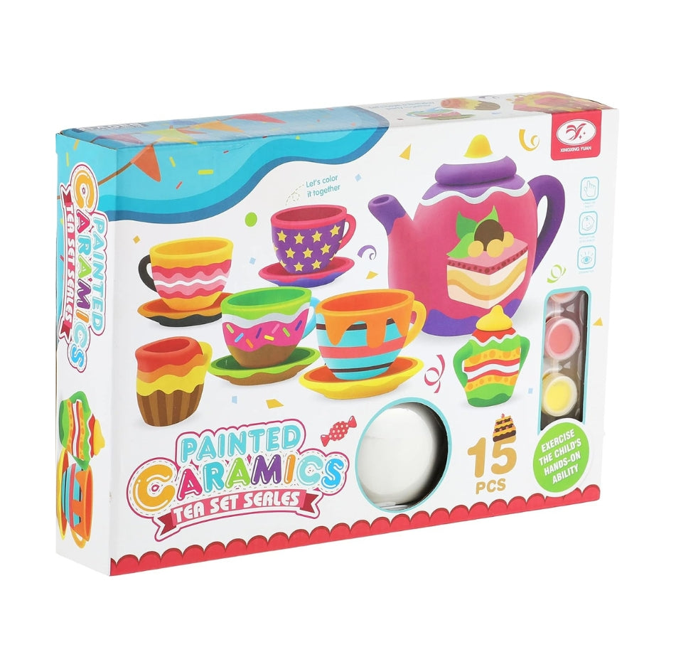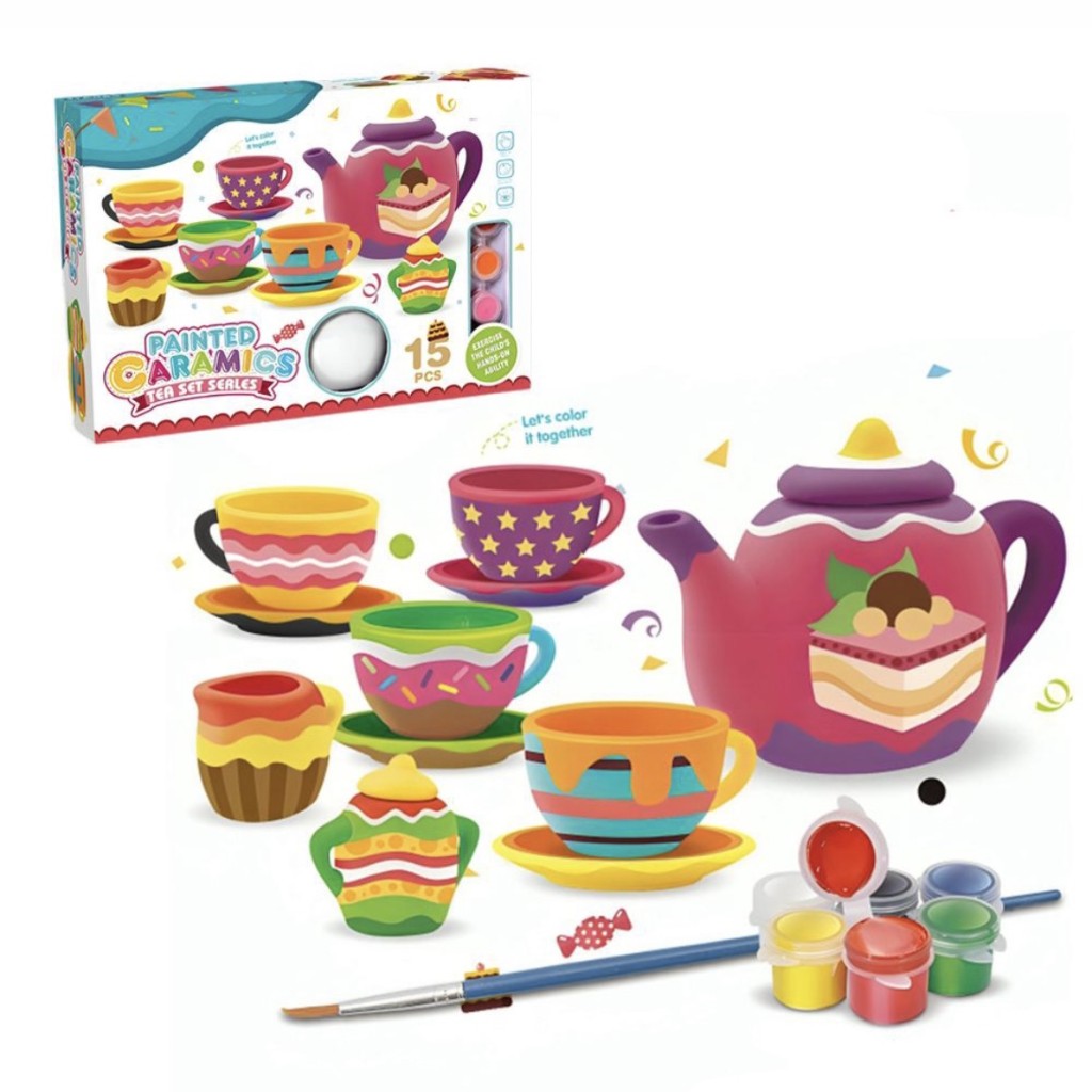 ست چایخوری ۱۵ تکه در دو طرح متفاوت شامل فنجان، نعلبکی، قوری و ابزار نقاشی برای کودکان بالای 3 سال؛ مناسب بازی تخیلی و خلاقیت با طراحی کیک و دسر.