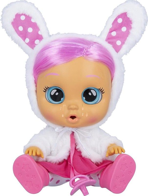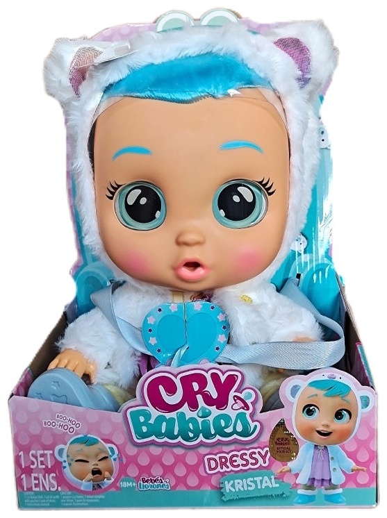 عروسک Cry Babies با موهای طبیعی، چشمهای درخشان و لباس شیک، مناسب کودکان بالای ۱۸ ماه برای بازی و آموزش مراقبت و مهارتهای اجتماعی.