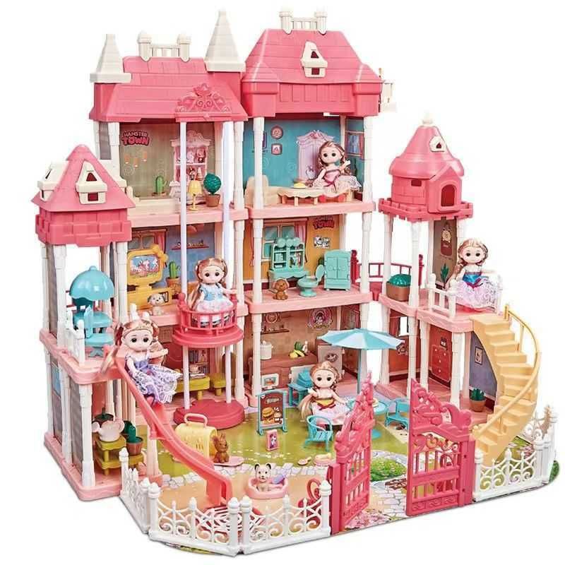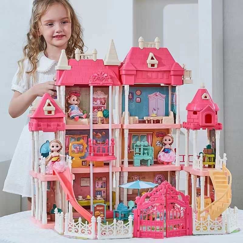 خانه عروسکی زیبا با سه طبقه، نورپردازی، موسیقی و لوازم کامل برای بازی و داستانگویی کودکان بالای ۳ سال.