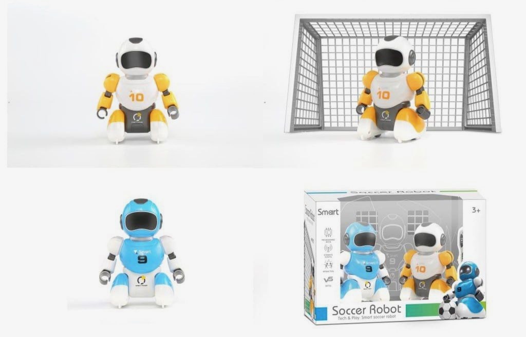• شامل ۲ ربات رنگی (زرد و آبی)، ۲ کنترلر، توپ و دروازه