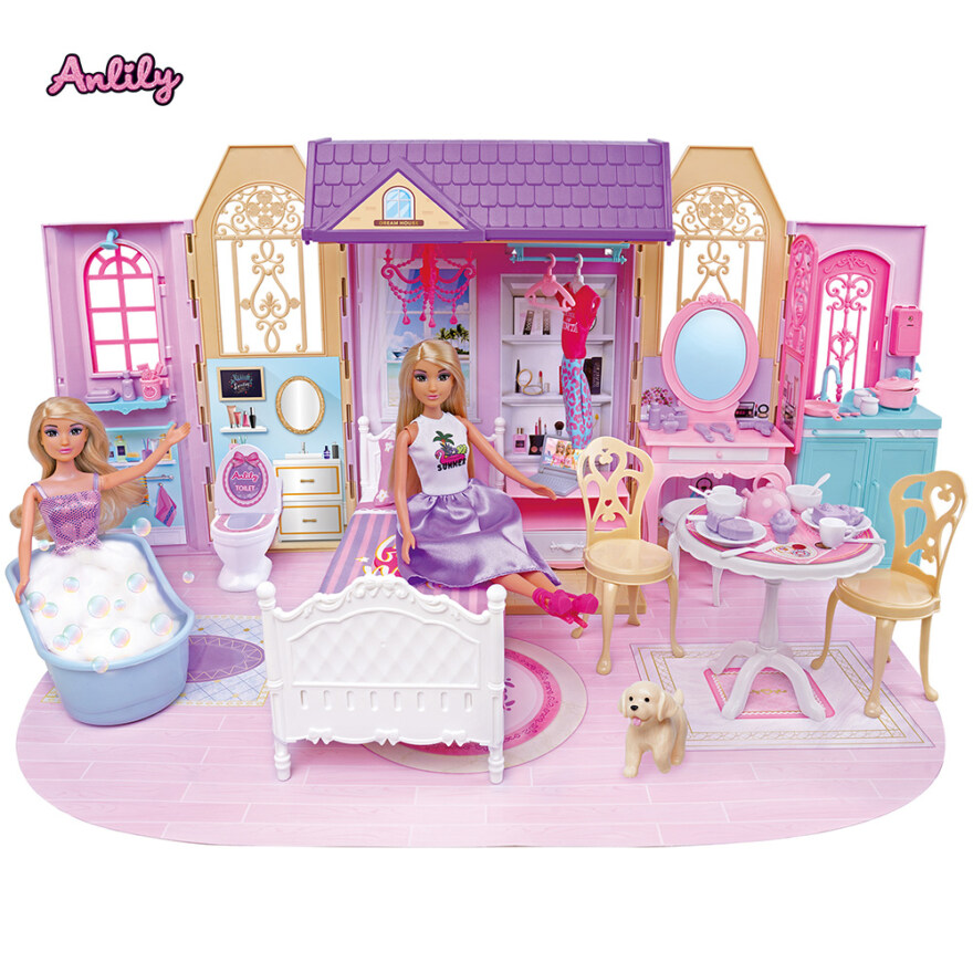 خانه عروسکی آنلی شامل مبلمان کامل، عروسک، سگ کوچک و زنگ در با صداست که تجربهای سرگرمکننده و واقعی برای بازیهای نقشآفرینی کودکان فراهم میکند.
