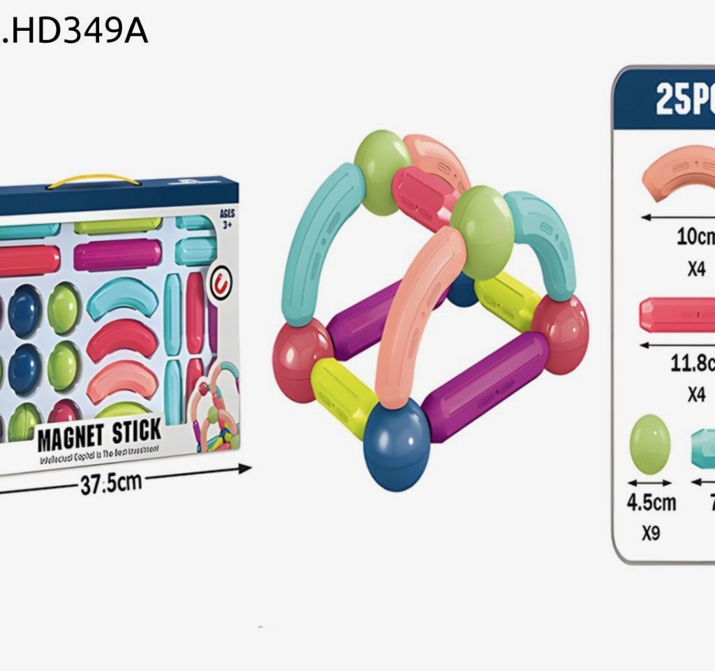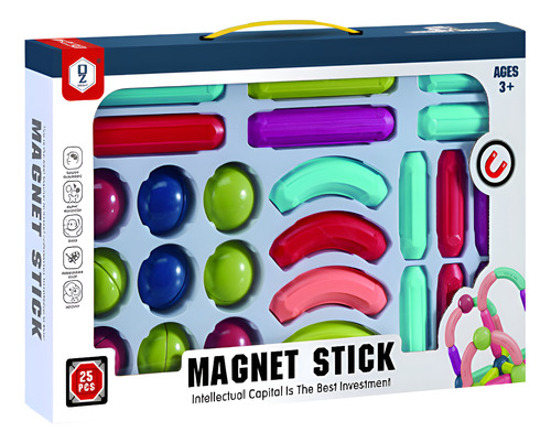 ست ۲۵ قطعهای مگنت شامل میلهها و توپهای مغناطیسی برای ساخت انواع شکلها و طرحهای خلاقانه، مناسب کودکان بالای سه سال.