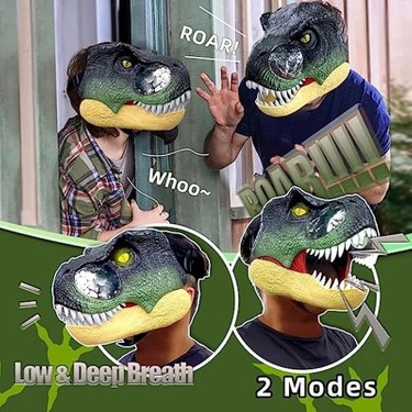 • فک ماسک بهصورت متحرک طراحی شده و هنگام حرکت فک پایین، با فک شما هماهنگ میشود تا حس واقعی دایناسور ایجاد شود.