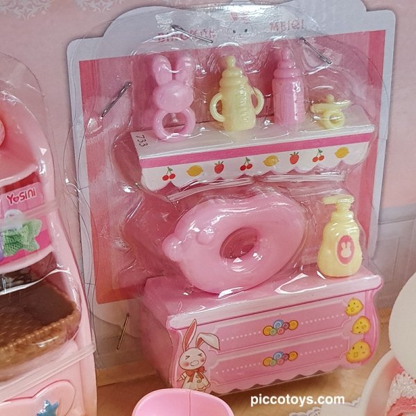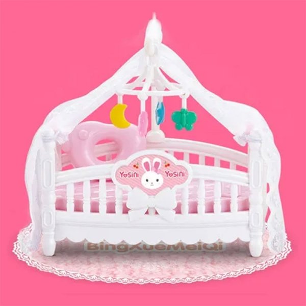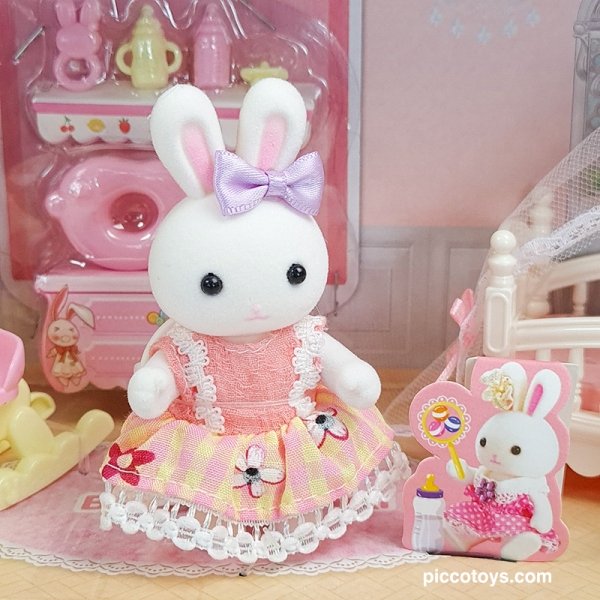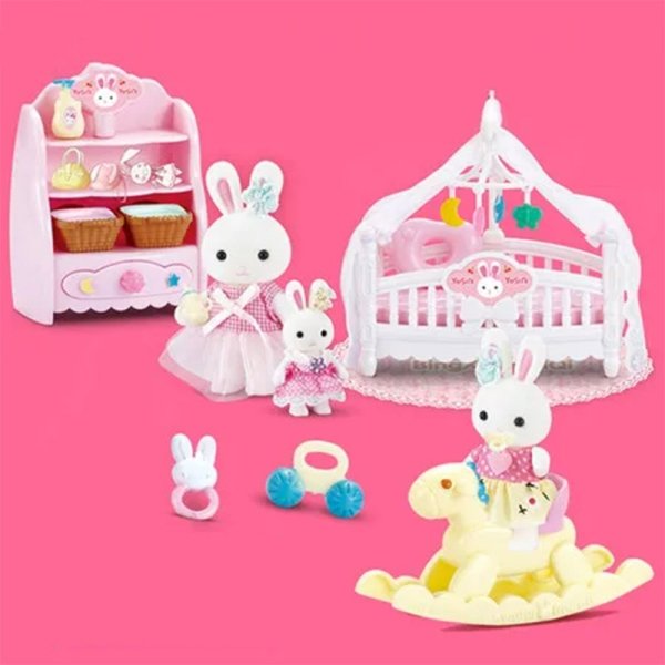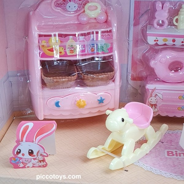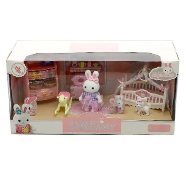 ست مینیاتوری اتاق خواب کودک با خرگوش سفید، تخت، دراور، جغجغه و وسایل جذاب دیگر؛ مناسب کودکان بالای ۳ سال برای بازیهای خلاقانه و نقشآفرینی.