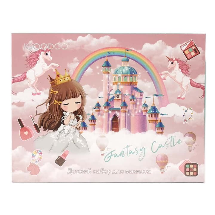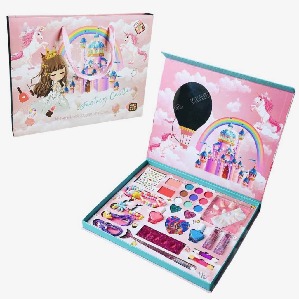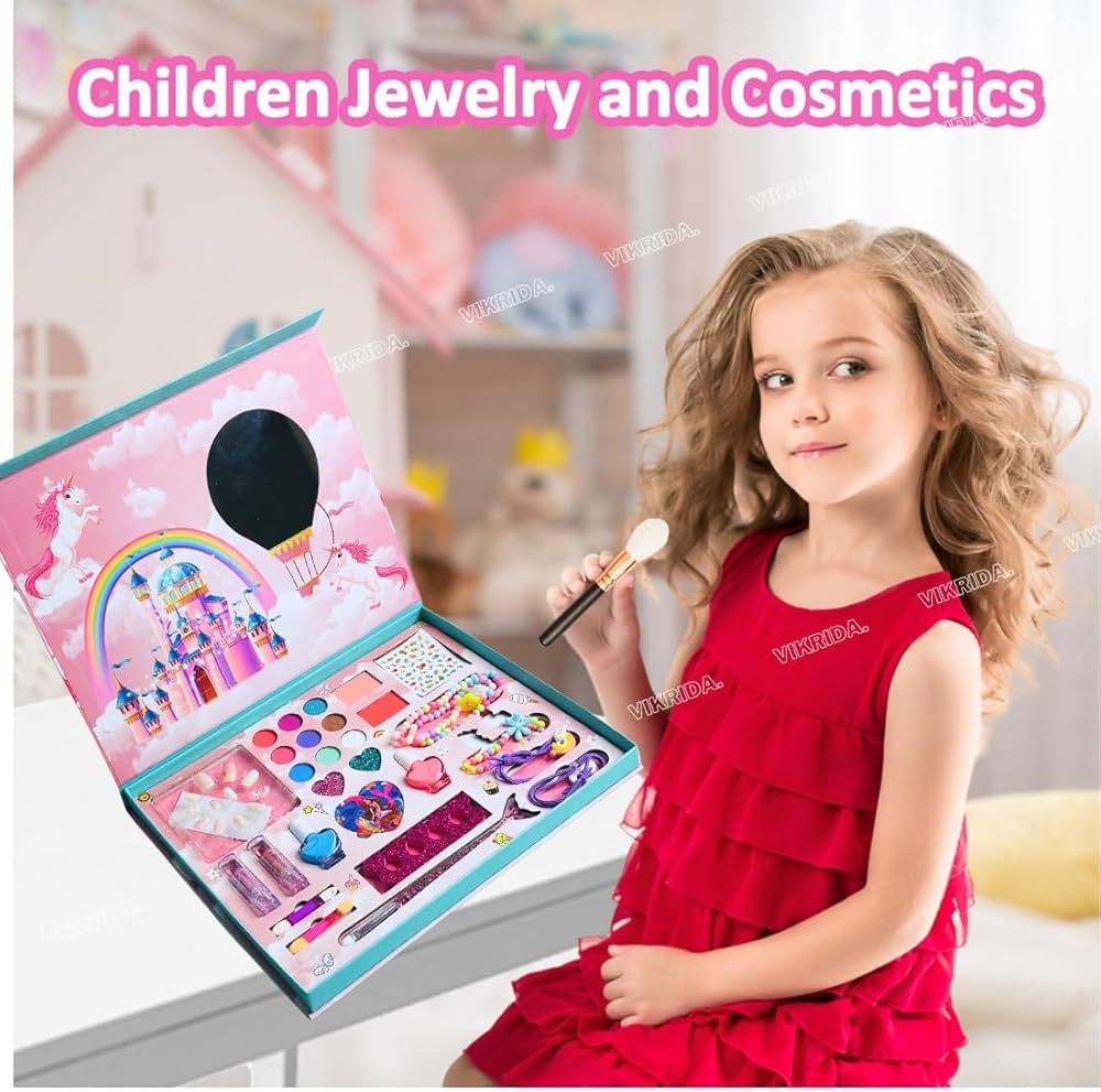 ست آرایش ایمن کودک شامل پالت ۲۸ رنگه، سایه چشم رنگی، برق لب و رژ نرم، به همراه مروارید و دستبند، مناسب دختران بالای سه سال برای بازی خلاقانه و سرگرمی ایمن.